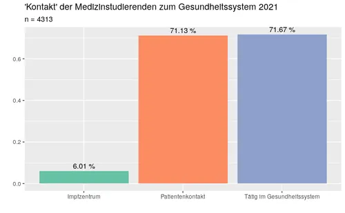 Die Erhebungen im Rahmen der COVRAM-Studie zeigen, dass sich viele Medizinstudierende neben ihrem Studium im Rahmen der Pandemiebewältigung (z.B. in Impfzentren) engagiert haben. Das überwältigende Engagement der Medizinstudierenden bestätigt sich auch in den Zahlen der Plattformen match4healthcare sowie Studis4ÖGD. Knapp jeweils 71% aller befragten Medizinstudierenden gaben in der Umfrage an, im Januar bis März 2021 Patient:innenkontakt gehabt zu haben oder im Gesundheitssystem tätig gewesen zu sein.