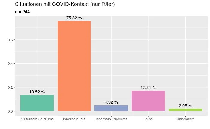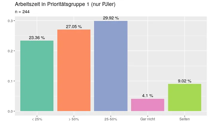 Insbesondere Medizinstudierende im PJ waren dauerhaft in Krankenhäusern und in der Gesundheitsversorgung im Einsatz und hatten entsprechend (Risiko-) Patient:innenkontakt. Das spiegelt sich auch in der COVRAM-Umfrage wider. In dieser Gruppe gaben 75,8% an, Kontakt zu akuten COVID-19-Fällen im Rahmen des Praktischen Jahres gehabt zu haben. Knapp 60% der PJ-Studierenden gaben eine Arbeitszeit von mehr als 25% und 28% sogar eine Arbeitszeit von über 50% im Arbeitsbereich der Impf-Prioritätsgruppe 1 gemäß STIKO an.