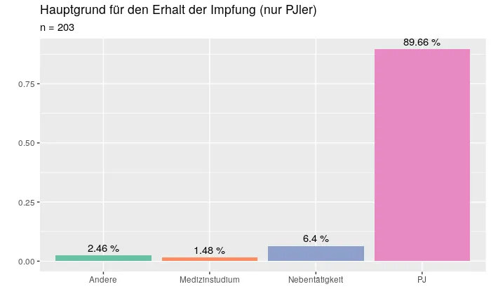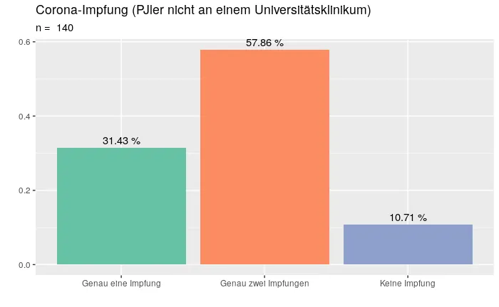Im Zeitraum der Umfrage waren 50.6% aller befragten Medizinstudierenden ungeimpft, 27,75% hatten eine und 21,63% zwei Impfungen erhalten; wobei über 60% der Nicht-PJ-Studierenden angaben, ihre Impfungen im Rahmen von Nebentätigkeiten erhalten zu haben. Fast 10% der Teilnehmenden im PJ haben Ihre Impfung nicht aufgrund ihres PJs allein bekommen. Die Impfquoten der Medizinstudierenden sind auch auf das Engagement einiger Fakultäten zurückzuführen. Hier sind der bvmd deutliche Unterschiede zwischen verschiedenen Fakultätsstandorten, Lehrkrankenhäusern und Universitätskliniken bekannt.